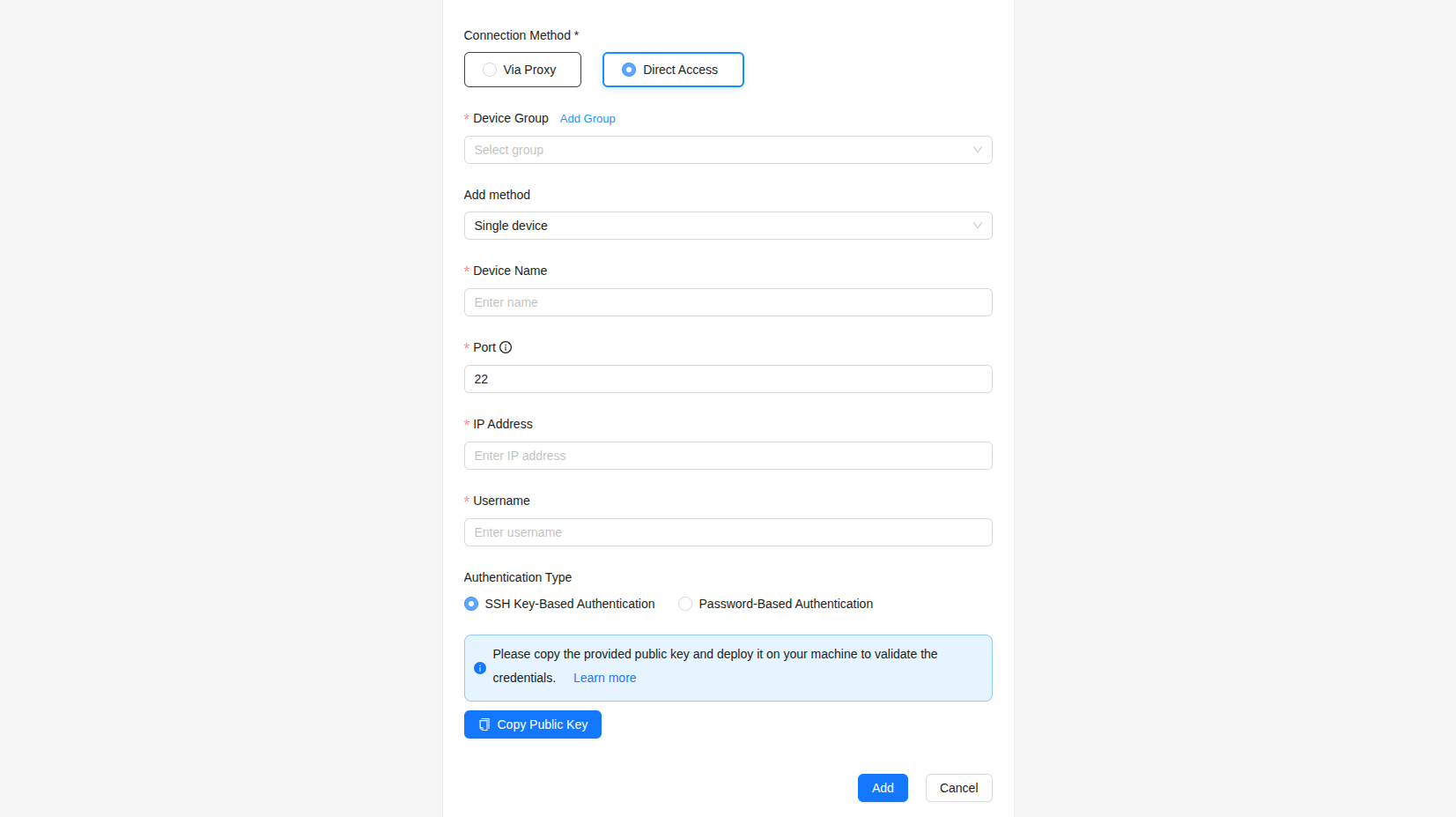 - Direct Access (public): For devices with public IPs reachable from the internet. No agent required. You select a device group and add single devices, bulk CSV, or Kubernetes cluster.