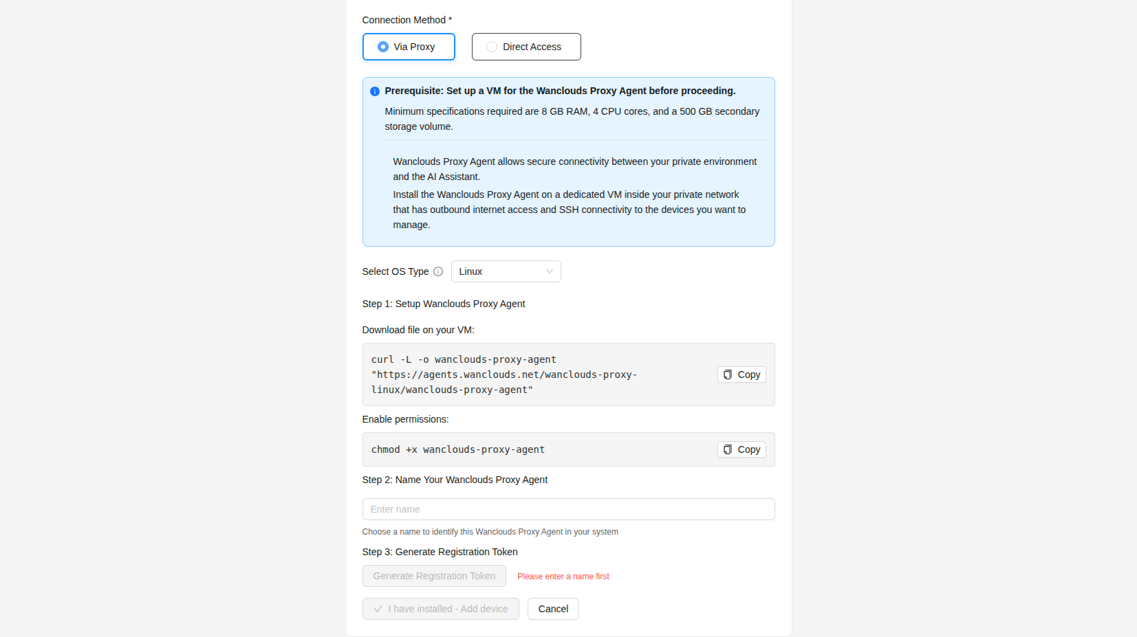 - Via Proxy (private): For devices with private IPs. Requires a Wanclouds Proxy Agent in your network. You select an existing agent or set up a new one, then add devices that the agent can reach via SSH (or WinRM for Windows).