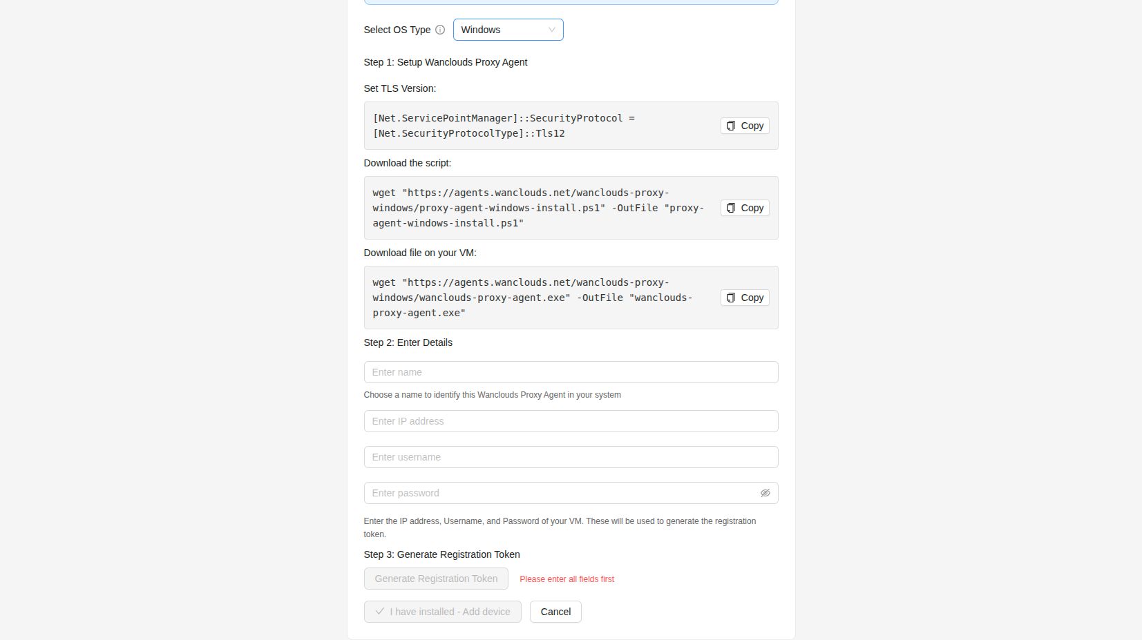 - Click "I have installed – Add Device". The new agent appears in the Wanclouds Proxy Agent dropdown. Use the refresh icon next to the dropdown if it does not appear immediately.