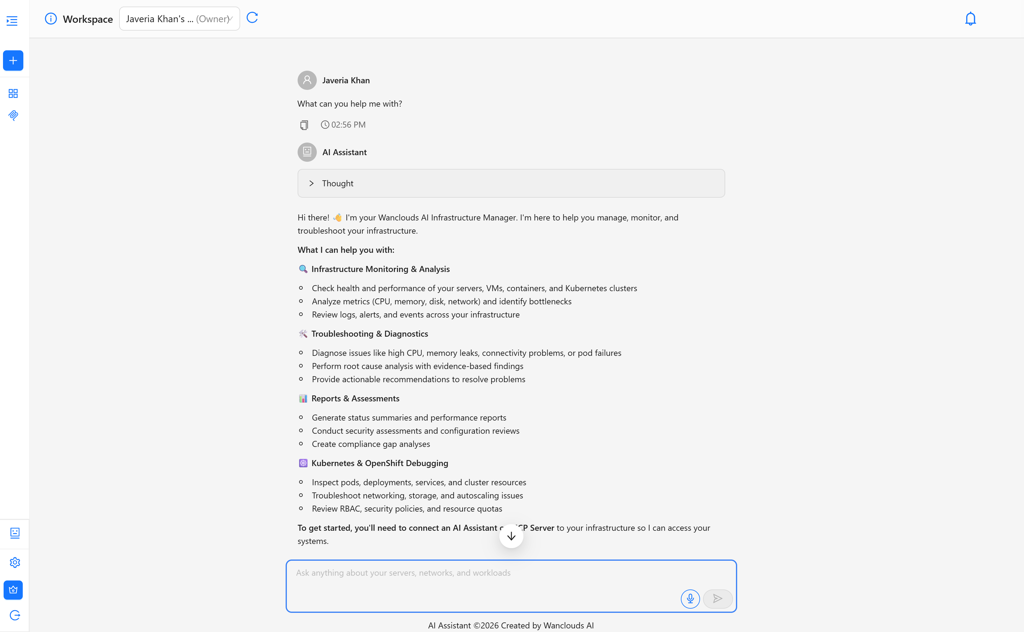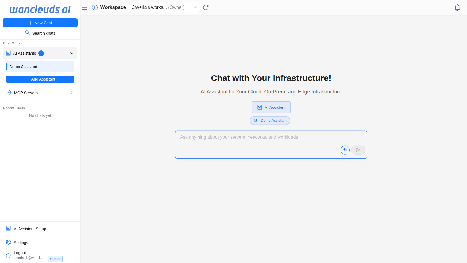 You can begin chatting immediately using the built-in Q&A agent. For full infrastructure management capabilities, setting up a dedicated AI Assistant is required.
