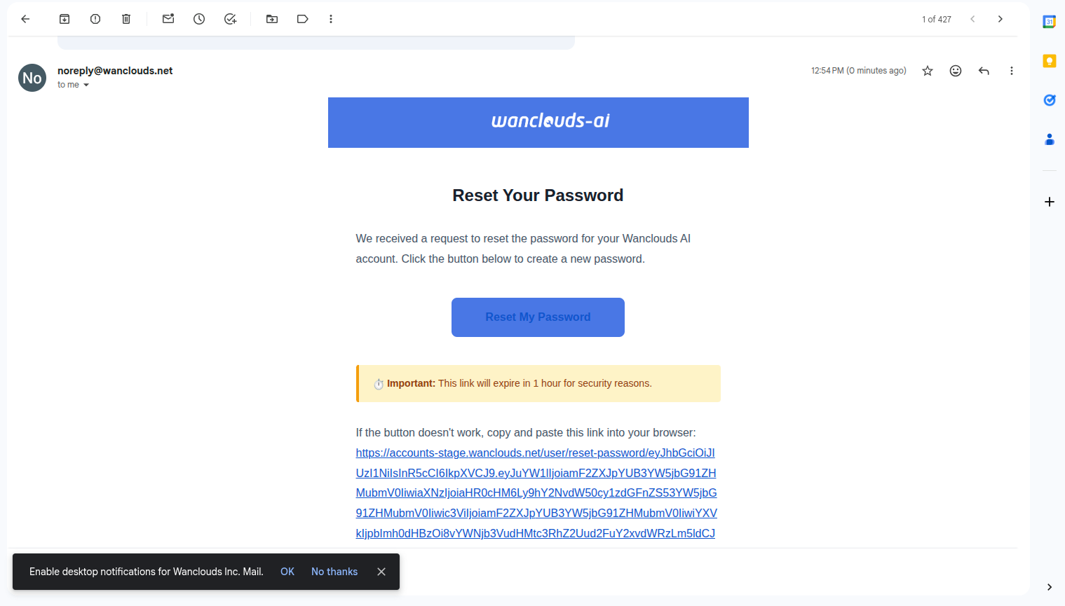 - Open the email from Wanclouds AI and click the Reset my Password button (or link) in the email.